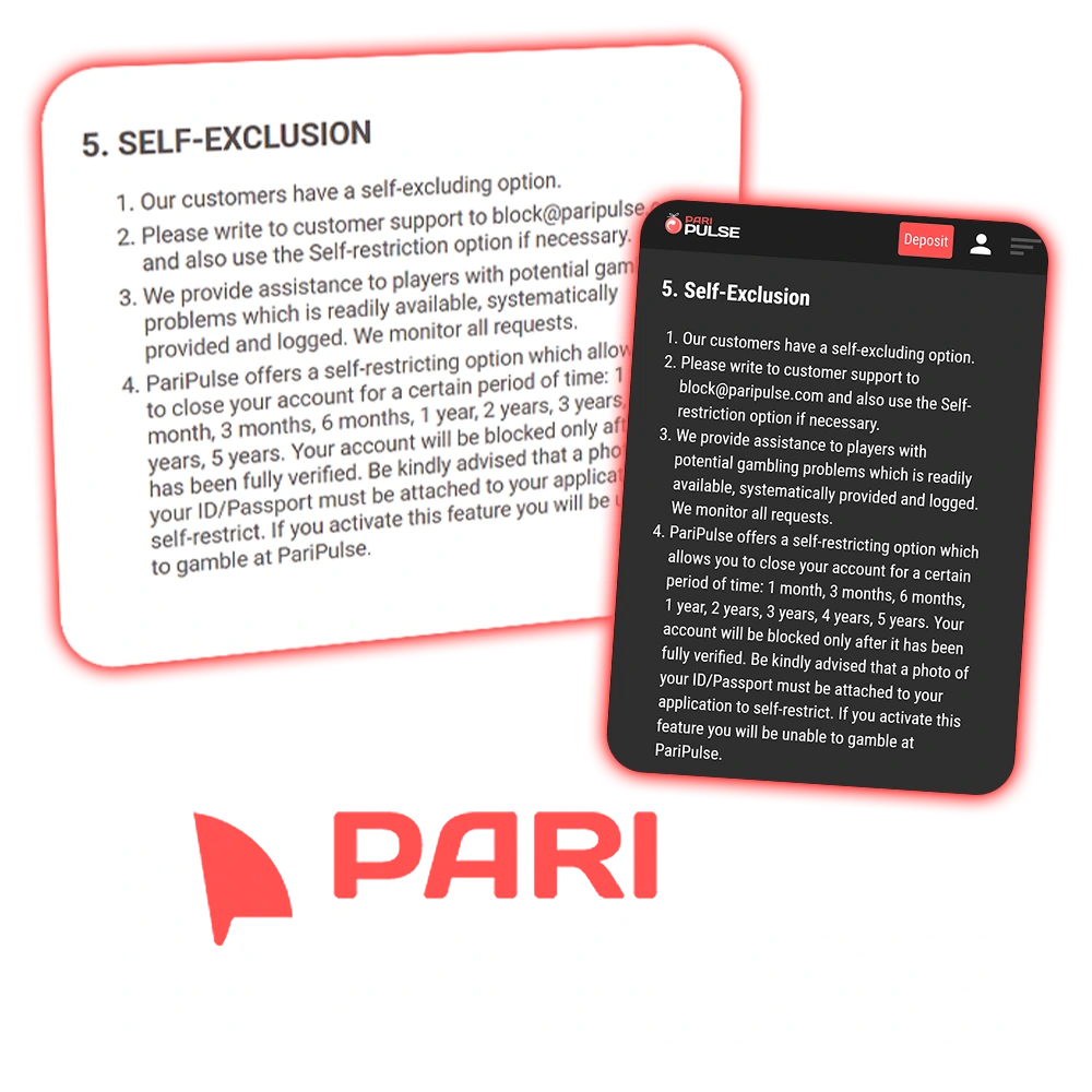4. You can use PariPulse’s self-restricting feature to shut down your account for a specific amount of time, such as one month, three months, six months, a year, two years, three years, four years, or five years. Only once your account has been thoroughly validated may it be banned. Please note that in order to self-restrict, a photo of your ID or passport must be included with your application. You will not be able to gamble at PariPulse if you enable this option.